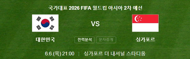 2026 북중미 월드컵 아시아 2차 예선 C조 5차전인 싱가포르와의 경기가 6월 6일 21시에 싱가포르 더 내셔널 스타디움에서 열립니다.