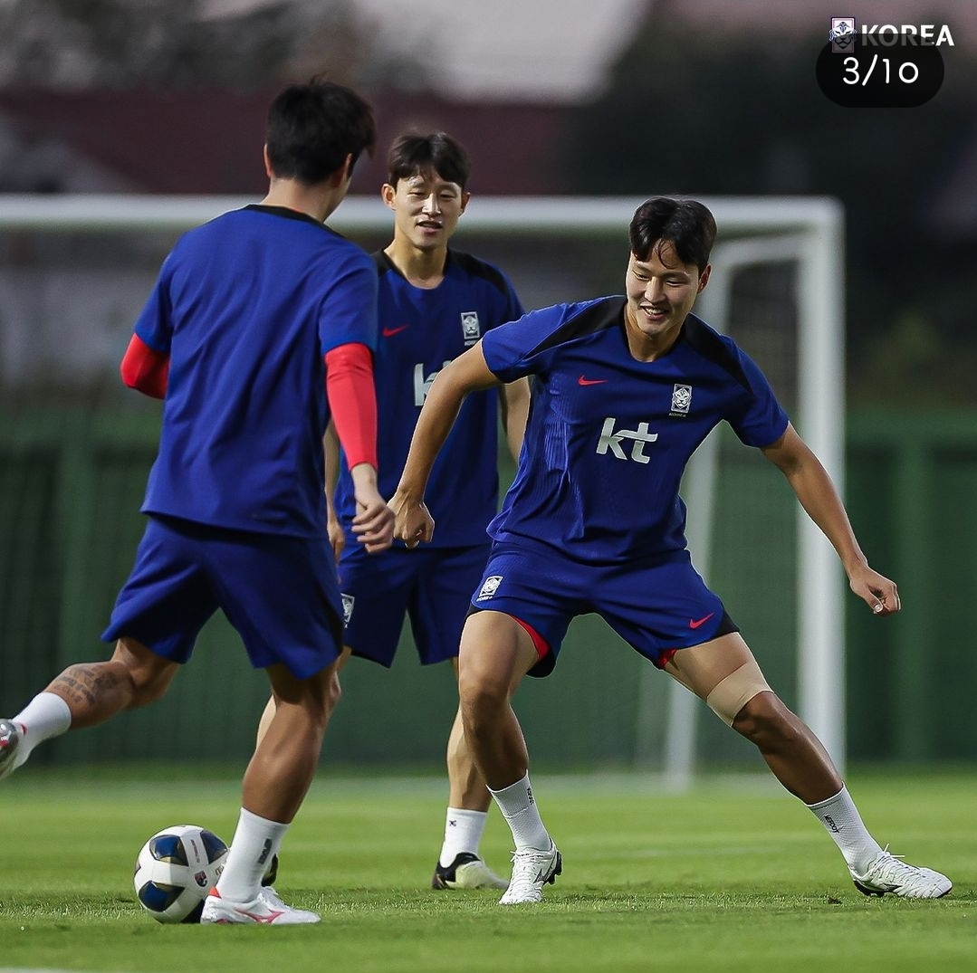공격수인 조규성 선수가 최전방에서 자리를 잡고, 손흥민 선수와 이강인 선수가 양 측면에 배치되었습니다. 중원은 이재성 선수, 백승호 선수, 황인범 선수 그리고 포백은 김진수 선수, 김영권 선수, 김민재 선수, 김문환 선수가 배치되었습니다. 골문은 태국전 1차전에서 좋은 활약을 보여줬던 조현우 선수가 지킵니다.
